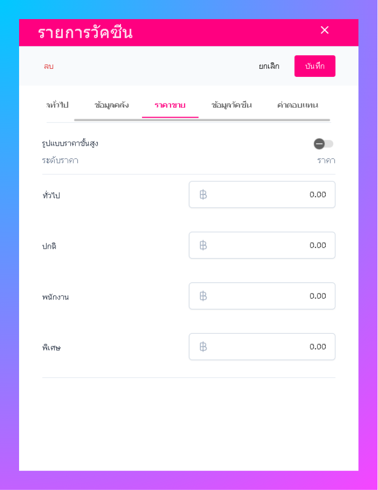 ผู้ใช้งานสามารถกำหนดราคาขายแก่ระดับราคาที่ผู้ใช้งานตั้งขึ้นมา หรือสามารถเปิดใช้งานรูปแบบการขายแบบขั้นสูงได้