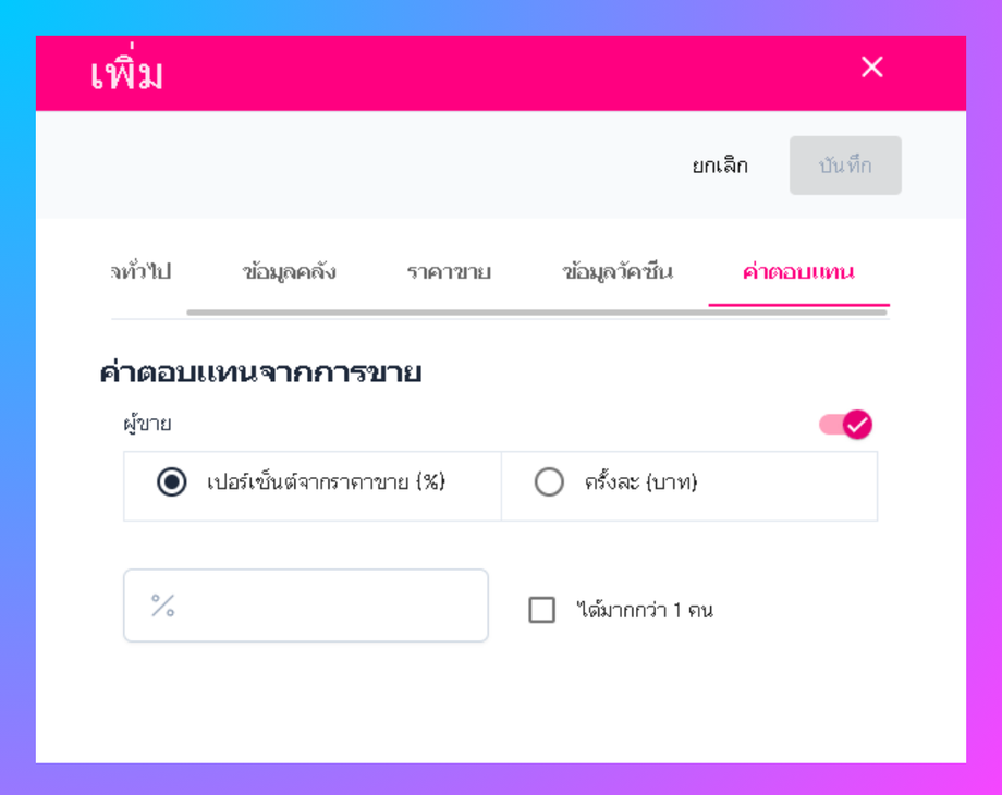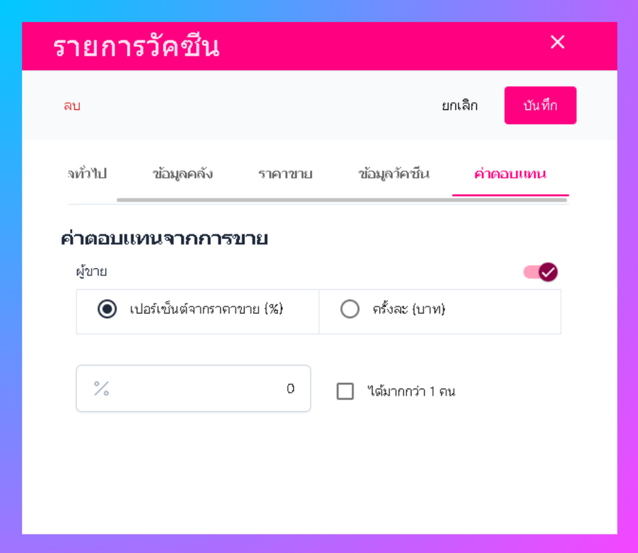 สามารถแก้ไขข้อมูล ค่าตอบแทนจากการขายได้สามารถแก้เป็นแบบเปอร์เซ็นหรือบาทได้ และสามารถแก้ไขการแบ่งค่าตอบแทนเป็นแบบเฉลี่ยหรือแบบบุคคลได้