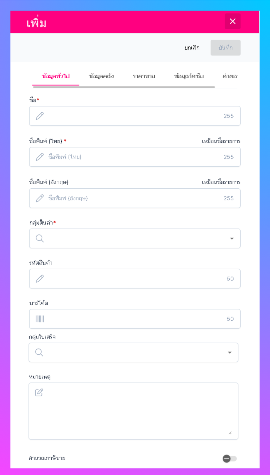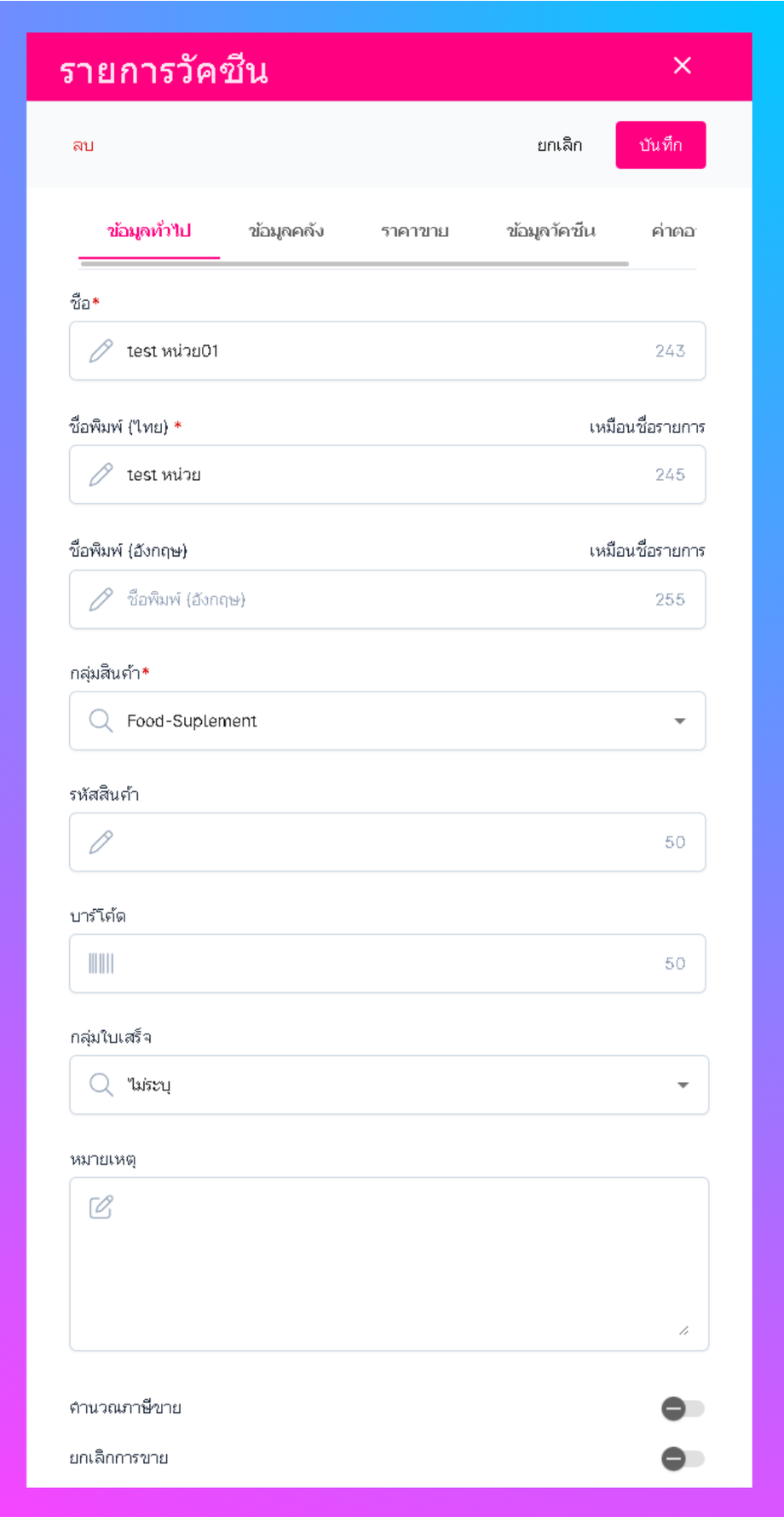จะมีหน้าต่างแสดงขึ้นมาให้แก้ไขข้อมูล ชื่อ ชื่อไทย ชื่ออังกฤษ รหัสสินค้า บาร์โค้ด กลุ่มใบเสร็จ  หมายเหตุ