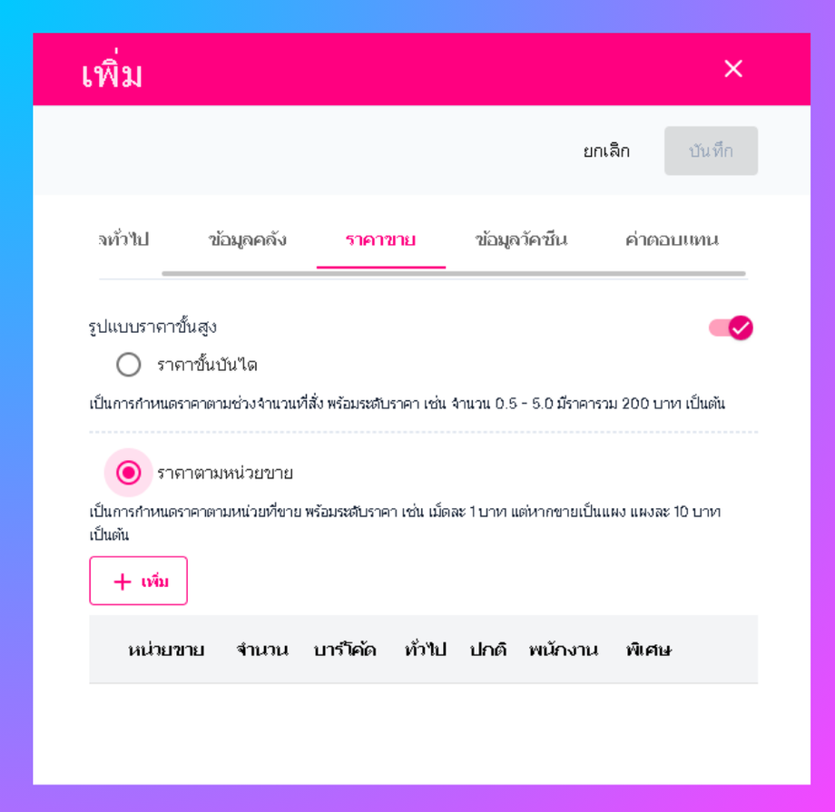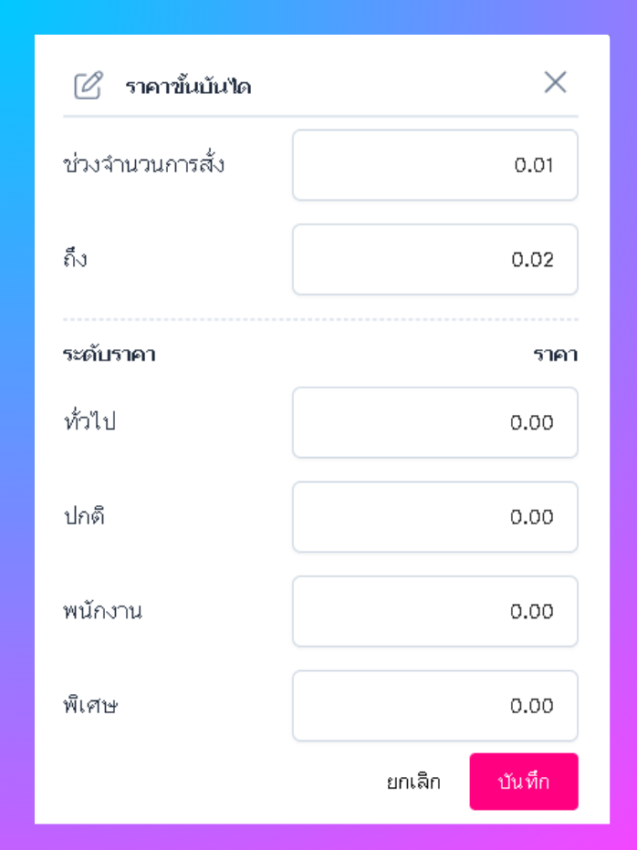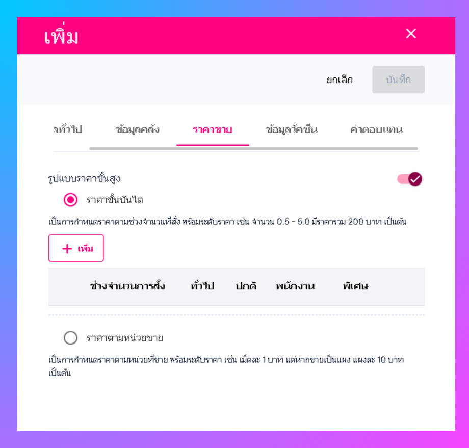 ผู้ใช้งานสามารถเพิ่มรูปแบบราคาขั้นบันได คือ กำหนดราคาสินค้า เช่น