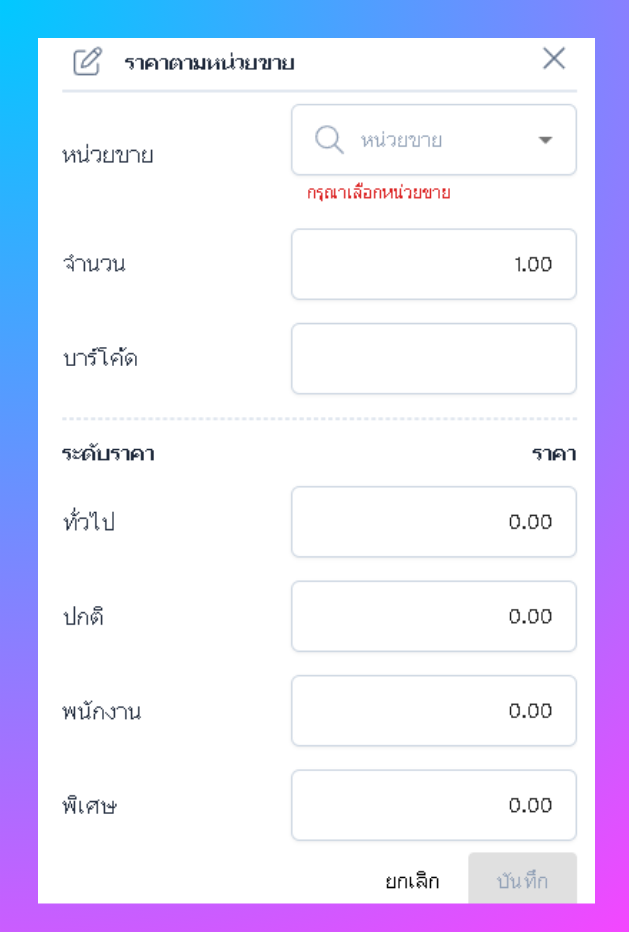 • ผู้ใช้งานสามารถกำหนด หน่วยการขาย และกำหนดระดับราคาได้