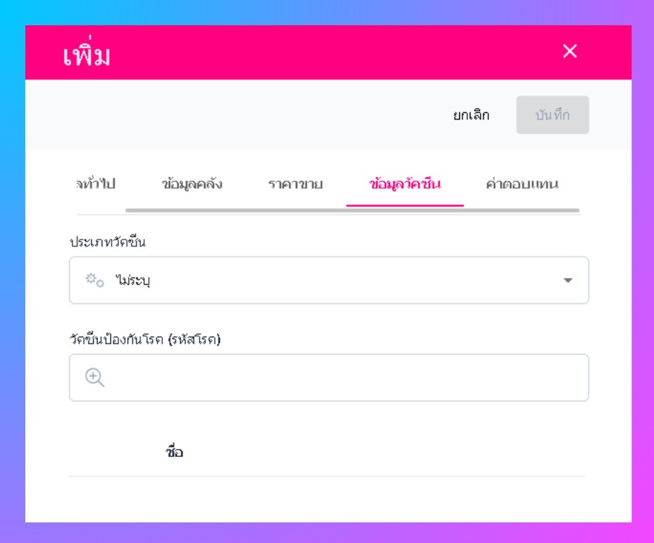 เมื่อผู้ใช้อยู่ในหน้ารายการวัคซีน คลิก +เพิ่ม ที่มุมขวาบน