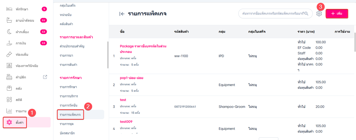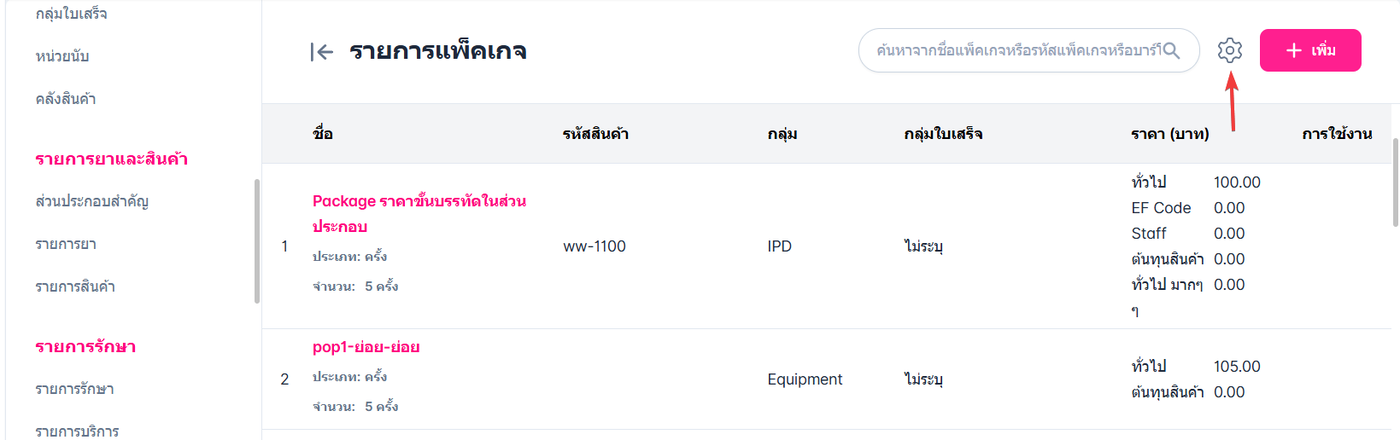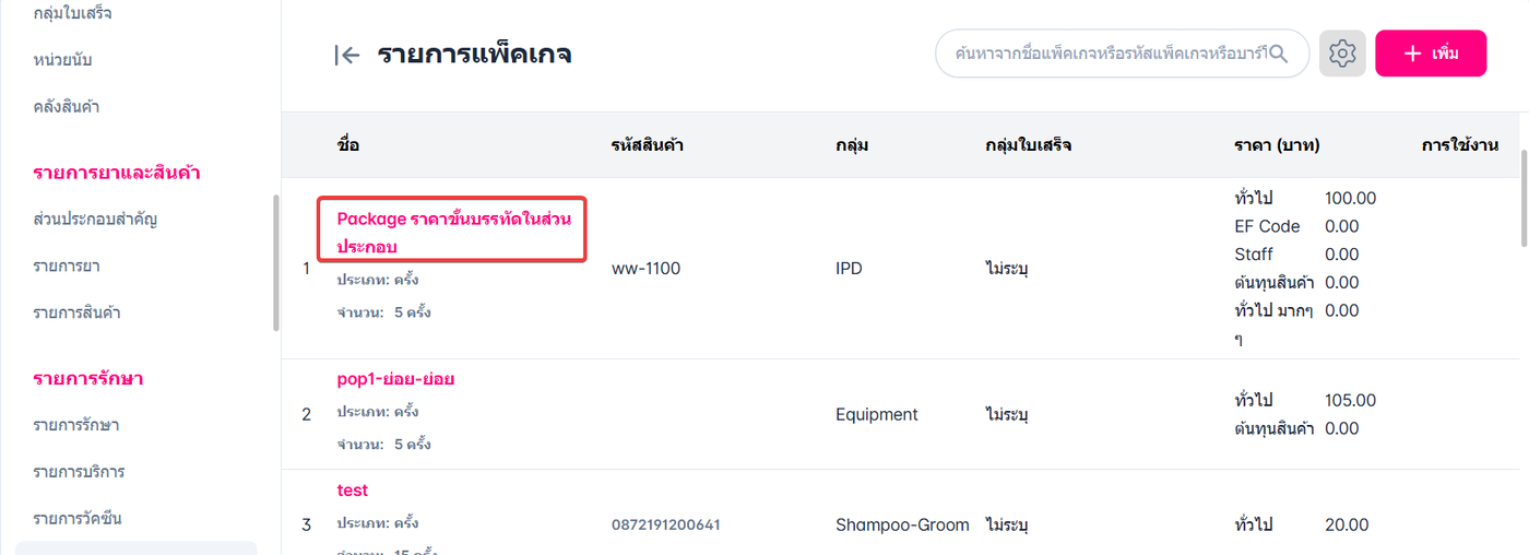 และไปที่หัวข้อรายการรักษา จากนั้นเลือกรายการแพ็คเกจ