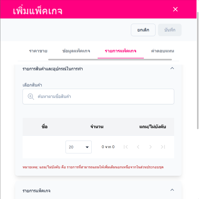 รายการสินค้าและอุปกรณ์ในการทำ : เลือกสินค้าและอุปกรณ์ให้อยู่ในแพ็คเกจ
