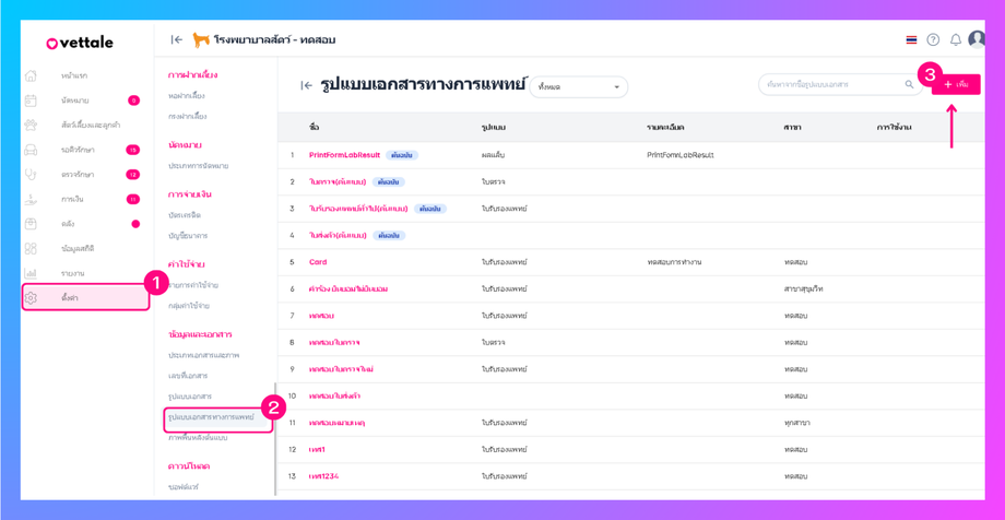 ไปที่การตั้งค่า > เลือกเมนูข้อมูลและเอกสาร > รูปแบบเอกสารทางการแพทย์ ให้ผู้ใช้งานคลิกปุ่ม "เพิ่ม"