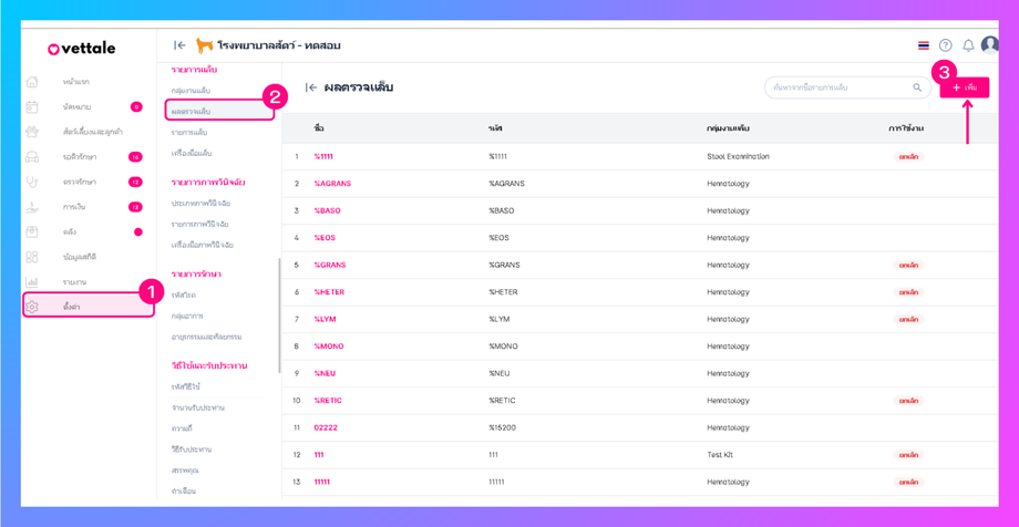 ผู้ใช้สามารถเพิ่มกลุ่มแล็บได้โดย ตั้งค่า > ผลตรวจแล็บ > คลิกปุ่มเพิ่ม