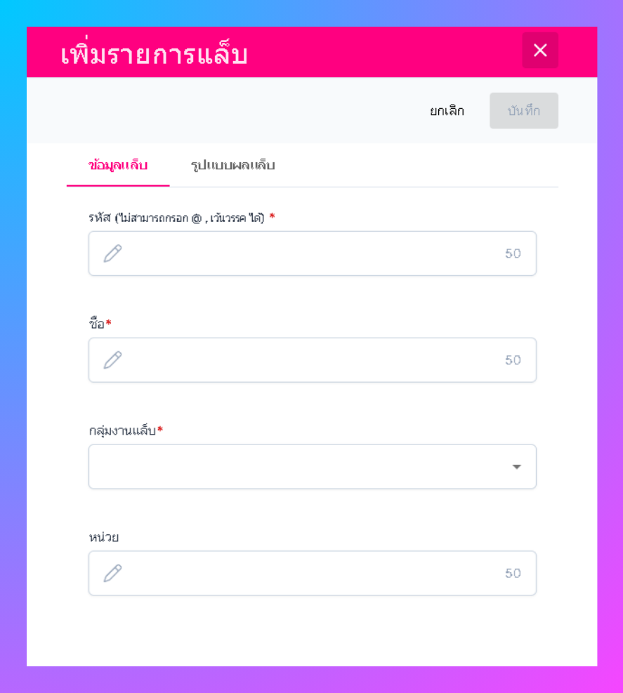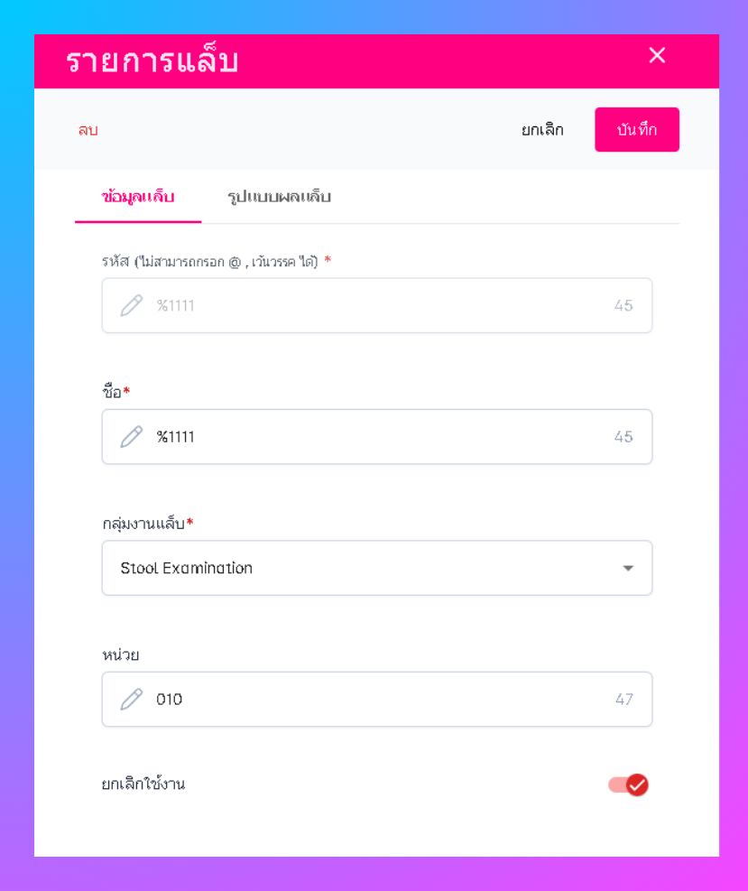 ผู้ใช้งานสามารถเพิ่ม รหัสผลการตรวจแล็บนั้นได้ ชื่อของผลตรวจ กลุ่มงานแล็บ หน่วยที่ใช้