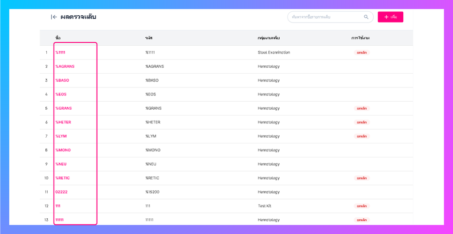 ผู้ใช้งานสามารถเพิ่มรูปแบบผลแล็บได้ และเพิ่มกลุ่มให้อยู่ในผลแล็บนี้ได้