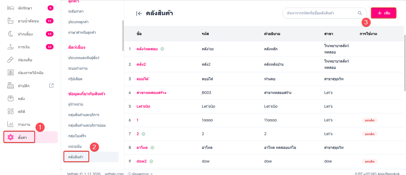 เมื่อผู้ใช้งานเข้าสู่หน้าคลังสินค้า ให้ผู้ใช้งานคลิกปุ่ม "+ เพิ่ม"