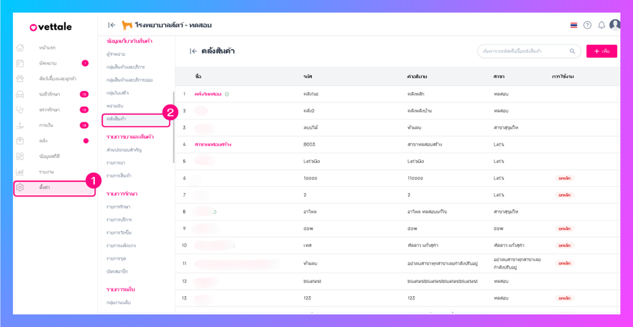 หากผู้ใช้งานต้องการตั้งค่าคลังสินค้า ทำได้โดยการไปที่เมนูตั้งค่า> ข้อมูลเกี่ยวกับสินค้า>คลังสินค้า