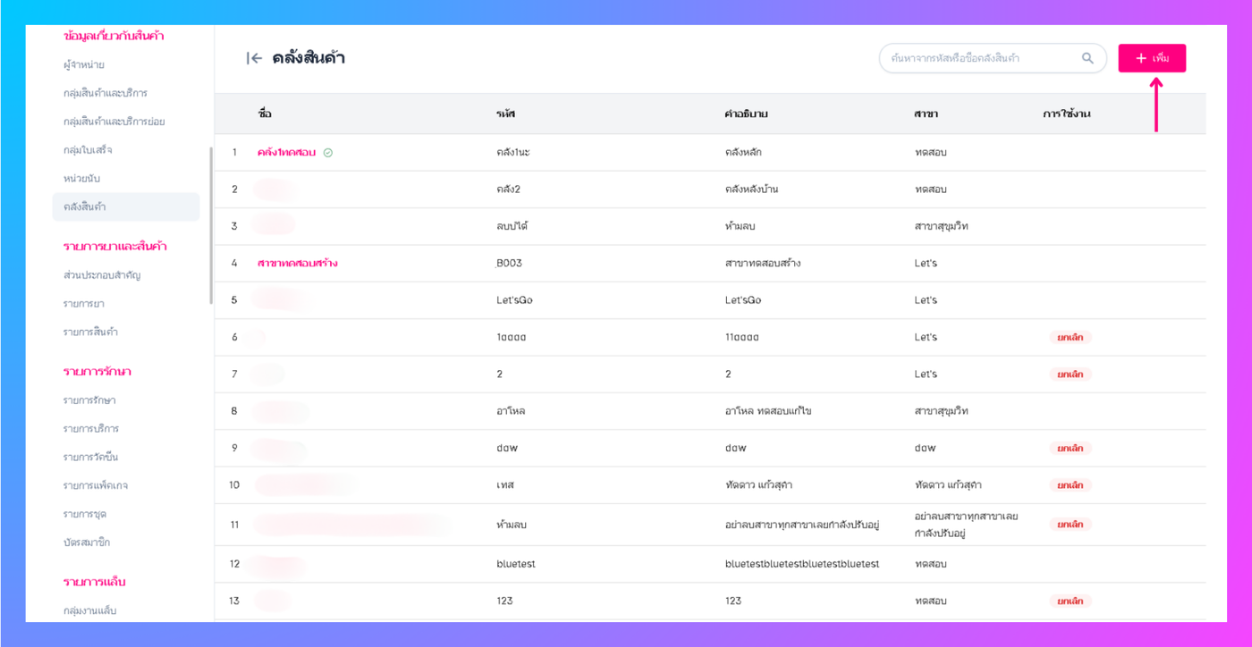 เมื่อผู้ใช้งานเข้าสู่หน้าคลังสินค้า ให้ผู้ใช้งานคลิกปุ่ม "เพิ่ม"
