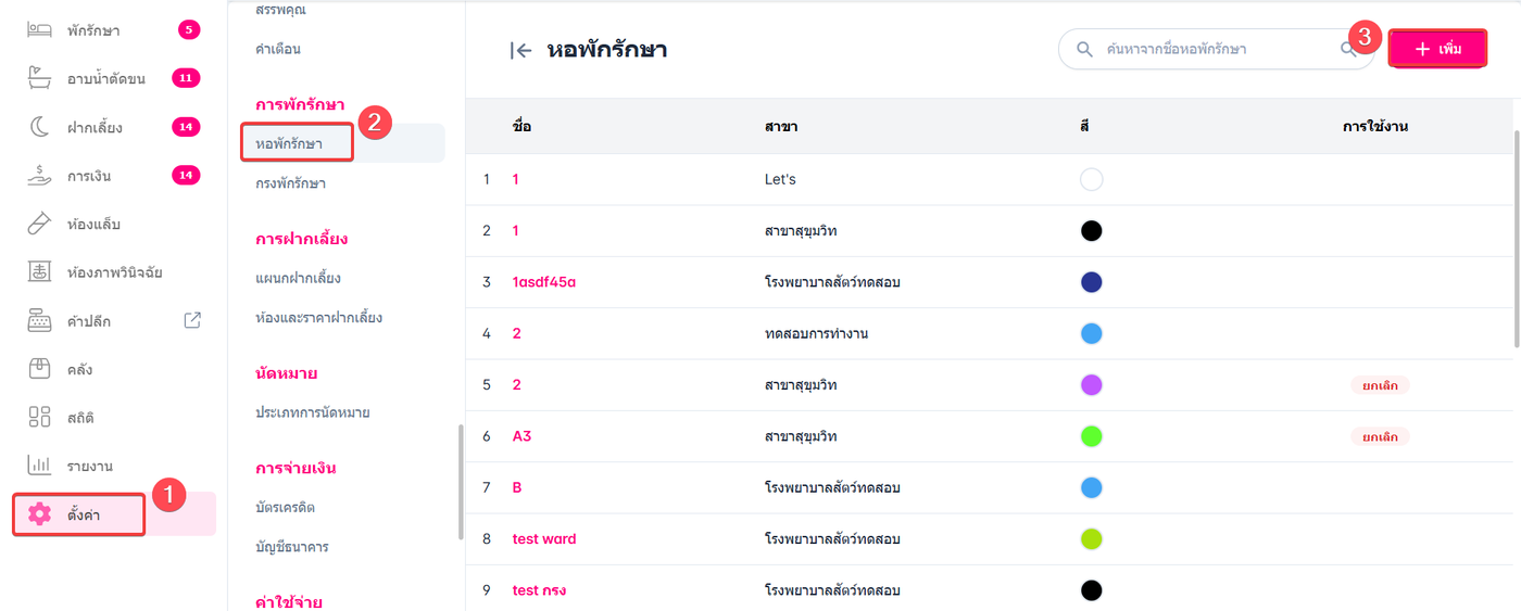 ส่วนที่ใช้จัดการข้อมูลพื้นที่สำหรับรับตัวสัตว์ป่วยไว้ค้างคืนเพื่อดูอาการโดยระบบจะช่วยให้คุณบริหารจัดการจำนวนที่ว่าง การแยกประเภทกรง และการติดตามสถานะของสัตว์ที่เข้าพักได้