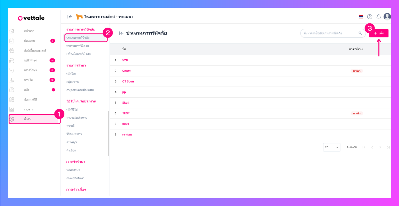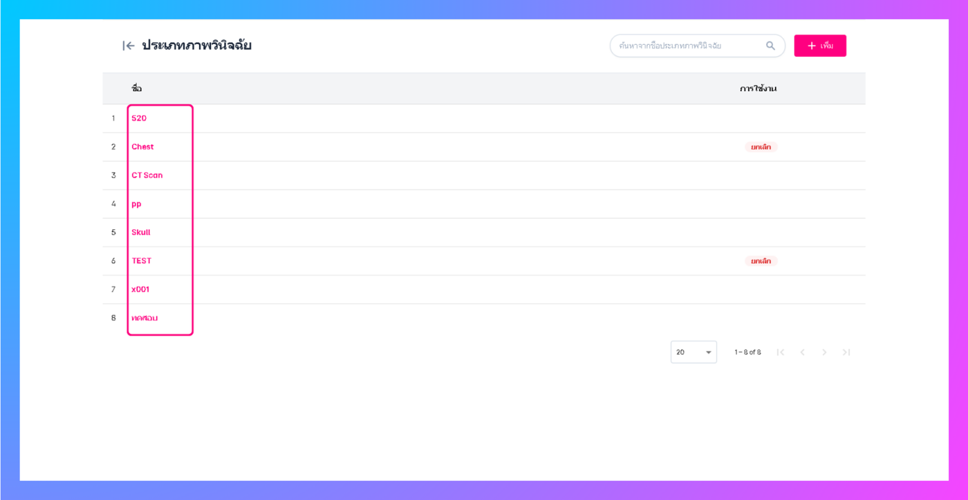ผู้ใช้งานสามารถเพิ่มประเภทภาพวินิจฉัยได้ไปที่ ตั้งค่า > ประเภทภาพวินิจฉัย > เพิ่มที่มุมขวาบน