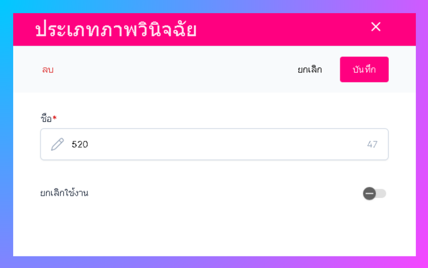 ผู้ใช้งานจะเข้าสู่หน้าแก้ไขสามารถแก้ไขชื่อ และยกเลิกใช้งานหรือลบ ประเภทภาพวินิฉัยนี้ได้