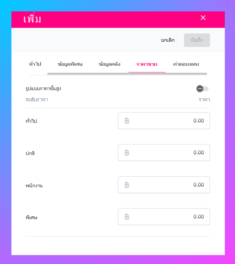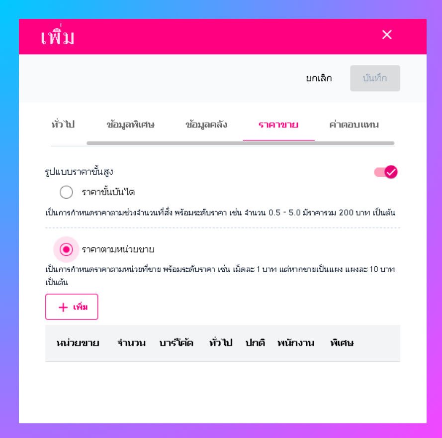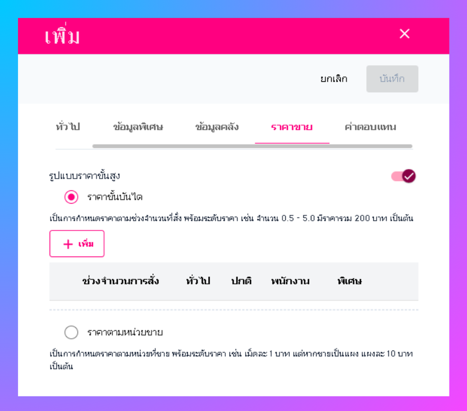 สามารถเลือกจัดการราคาแต่ละประเภทได้ ผู้ใช้งานสามารถเปิดใช้งานรูปแบบการขายแบบขั้นสูงได้