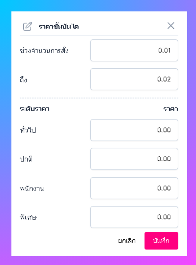 ผู้ใช้งานสามารถเพิ่มรูปแบบราคาขั้นบันได                                                                                                                                                               คือ กำหนดราคาสินค้า เช่น
