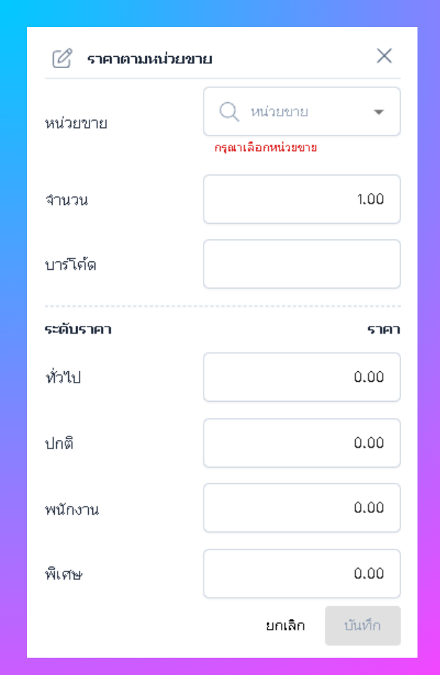 • ผู้ใช้งานสามารถกำหนด หน่วยการขาย กำหนดจำนวน