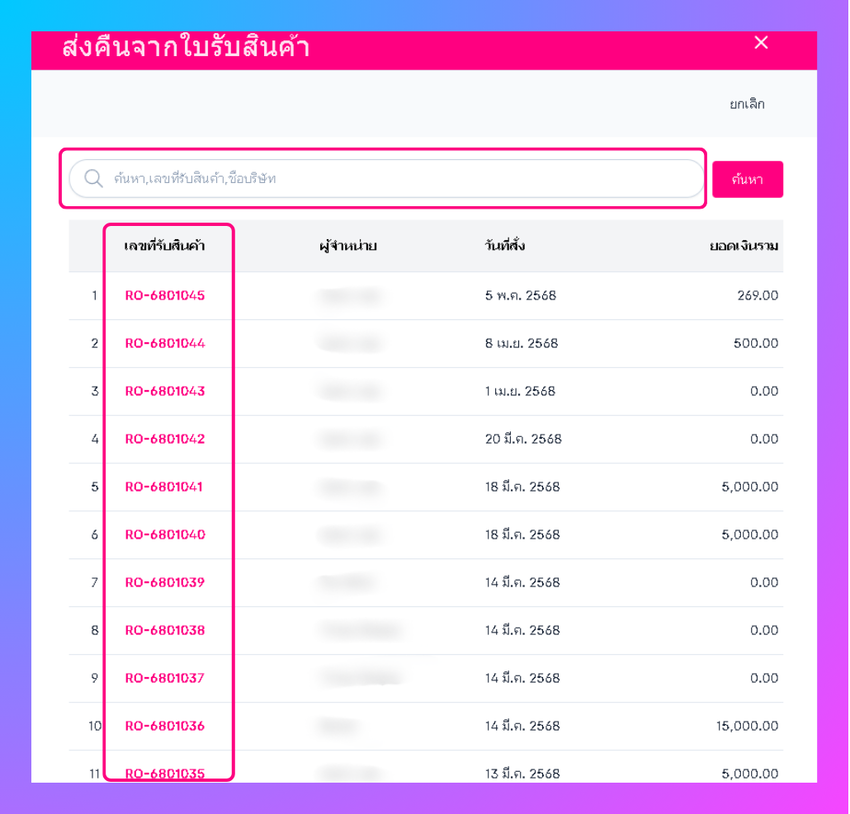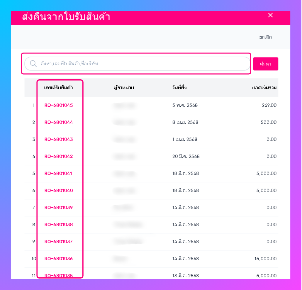 - เมื่อผู้ใช้เลือกรายการส่งคืนจากการรับสินค้า ระบบจะแสดงหน้าต่างให้ผู้ใช้งานเลือกรายการผู้จำหน่าย ผู้ใช้งานสามารถค้นหา หรือกดที่รหัสได้