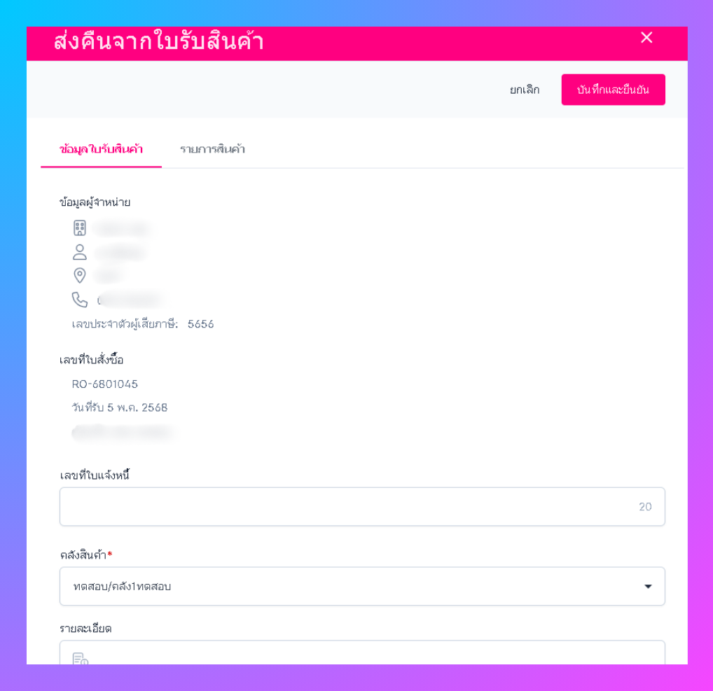 - ให้ผู้ใช้กรอกชื่อบริษัท และคลังสินค้าที่ต้องการคืนสินค้า