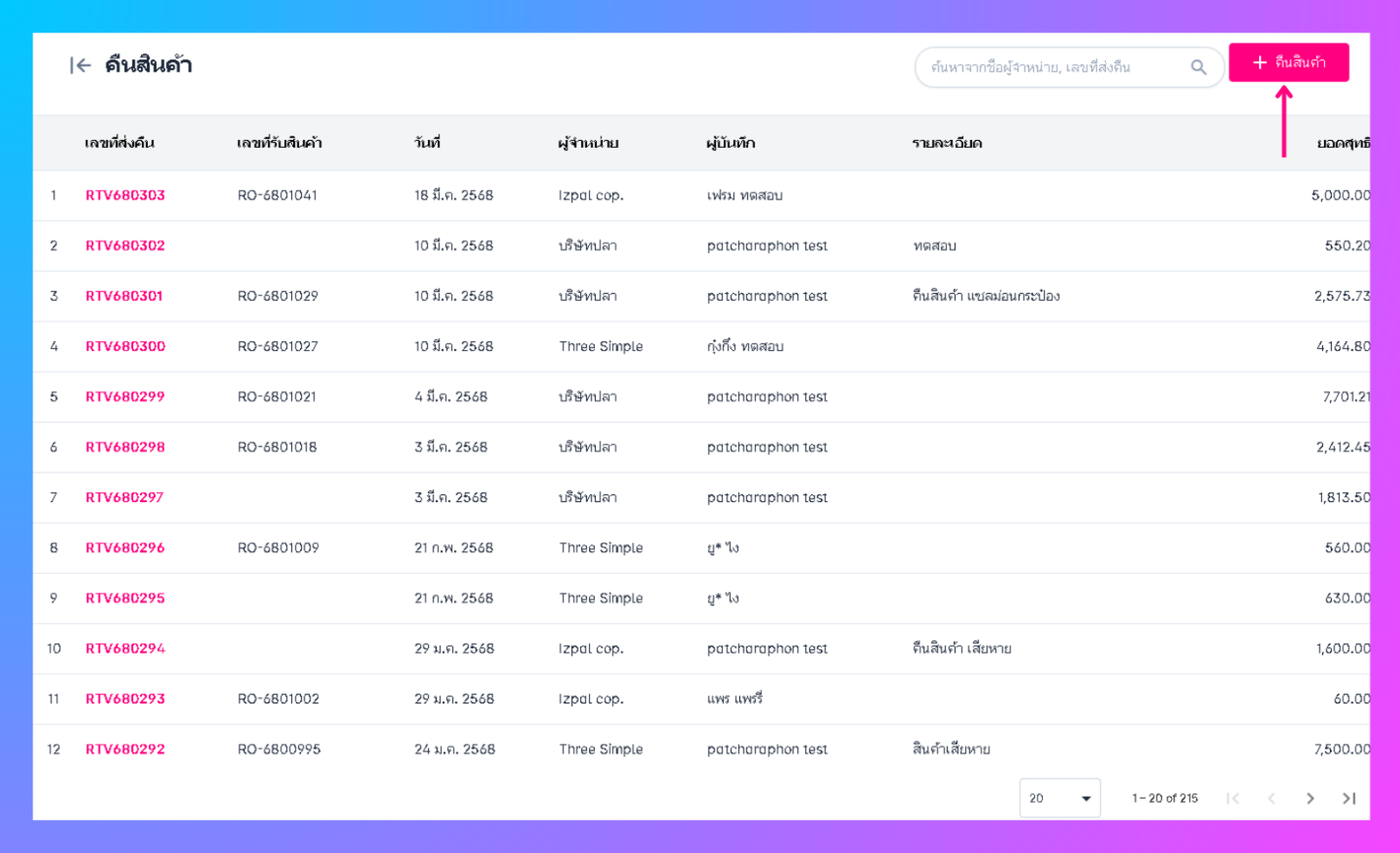 - เมื่อผู้ใช้งานเข้าสู่หน้าคืนสินค้า ให้ผู้ใช้งานกด คืนสินค้า