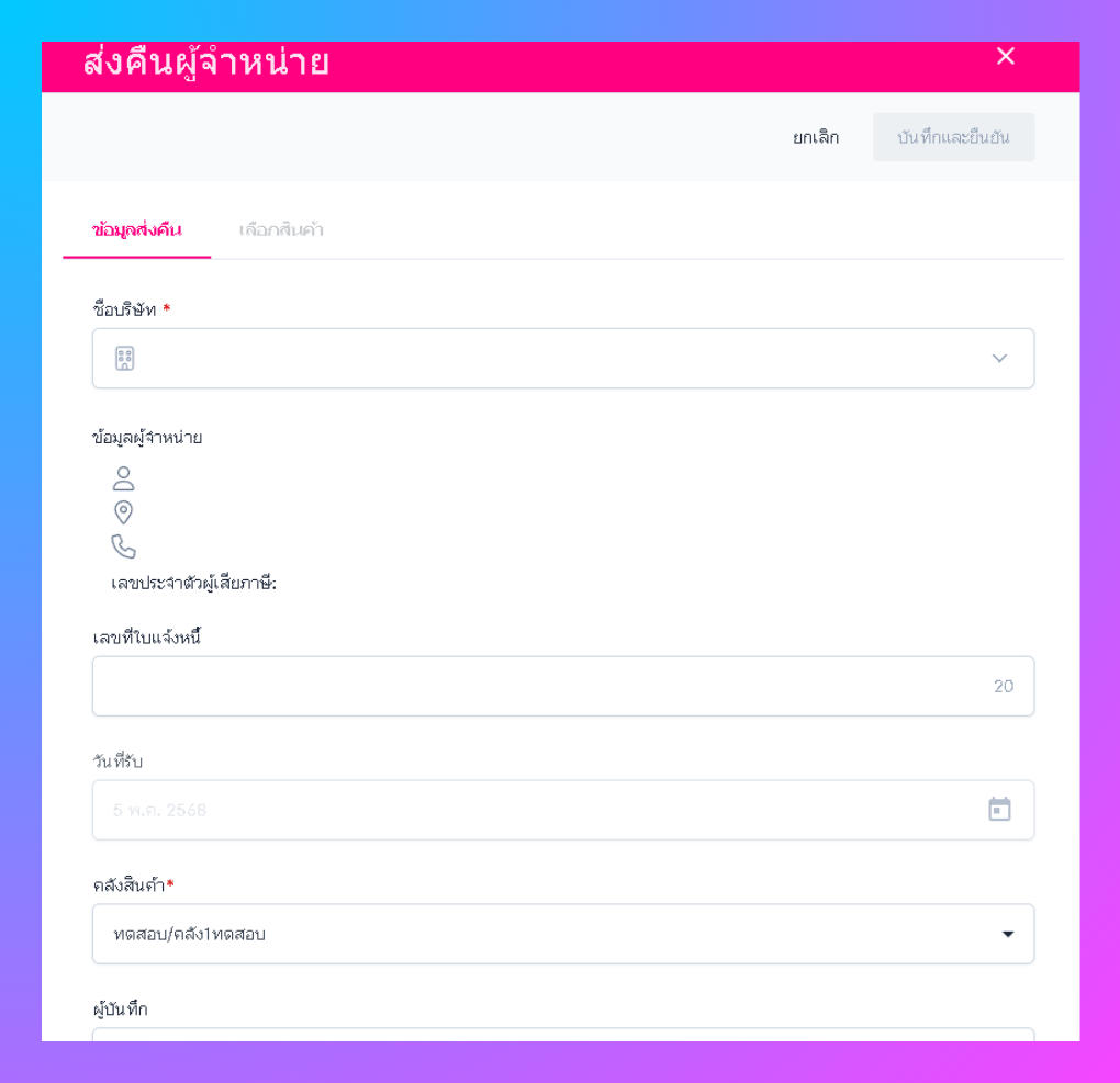 ให้ผู้ใช้กรอกชื่อบริษัท และคลังสินค้าที่ต้องการคืนสินค้า