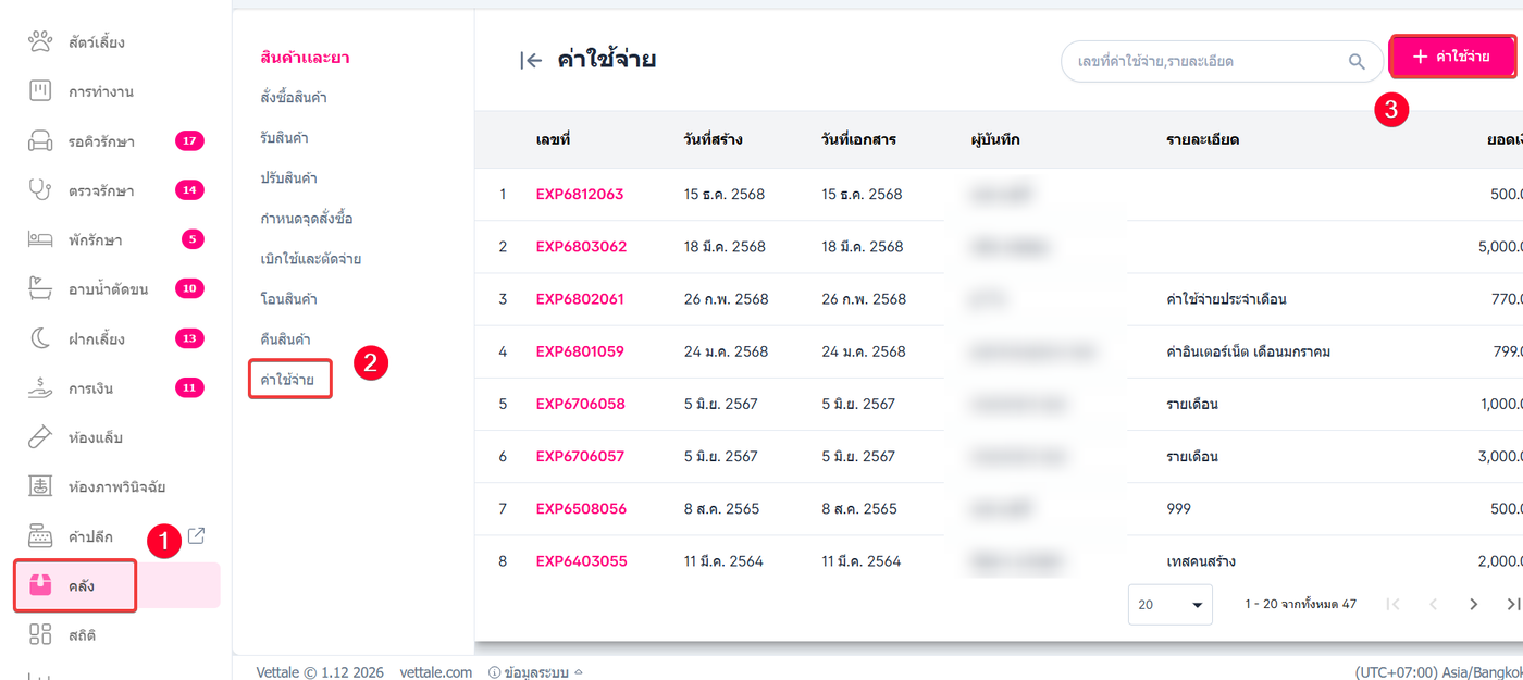 • จากนั้นให้กดเมนูค่าใช้จ่าย เลือกรายการค่าใช้จ่าย มีรายละเอียดดังนี้
