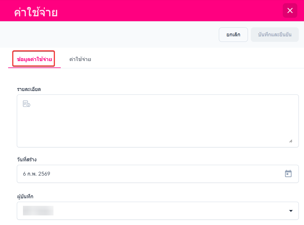• ระบบจะแสดงหน้าต่างกรอกข้อมูลค่าใช้จ่าย มีรายละเอียดให้กรอกข้อมูลดังนี้