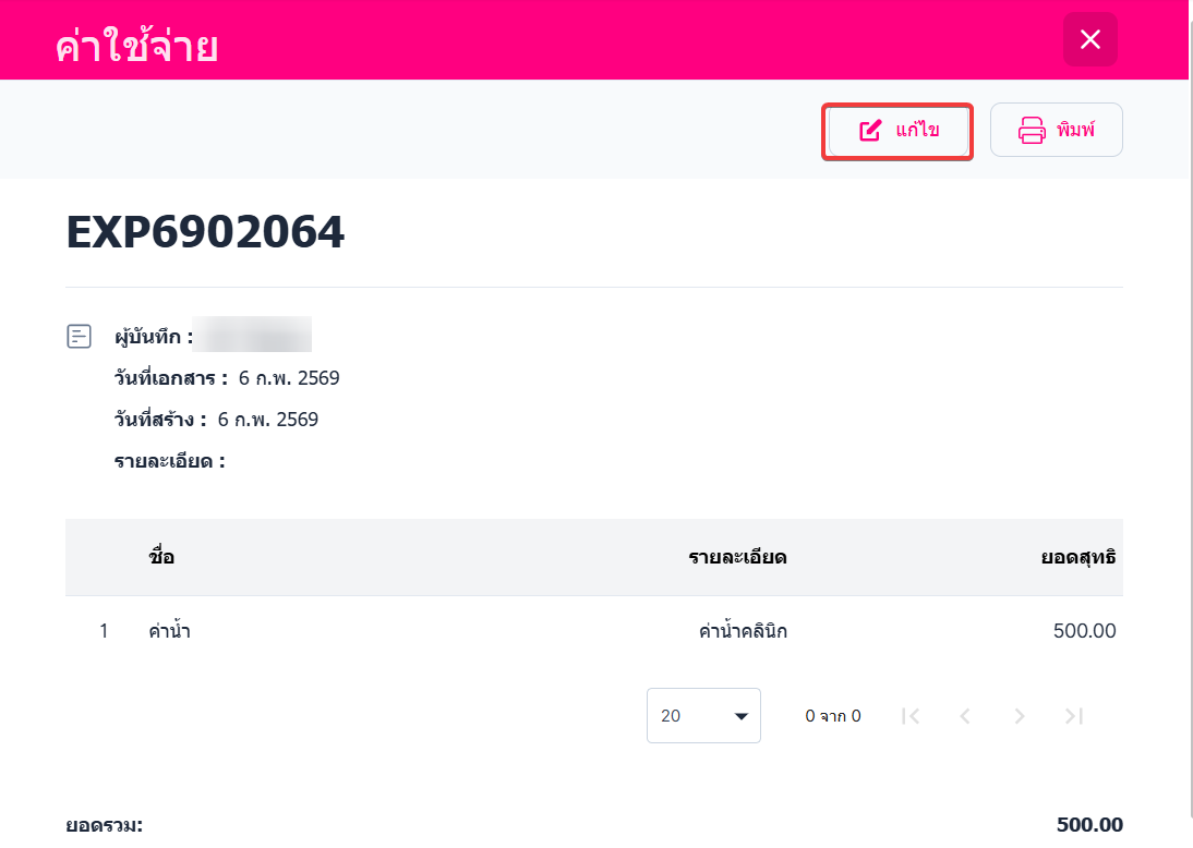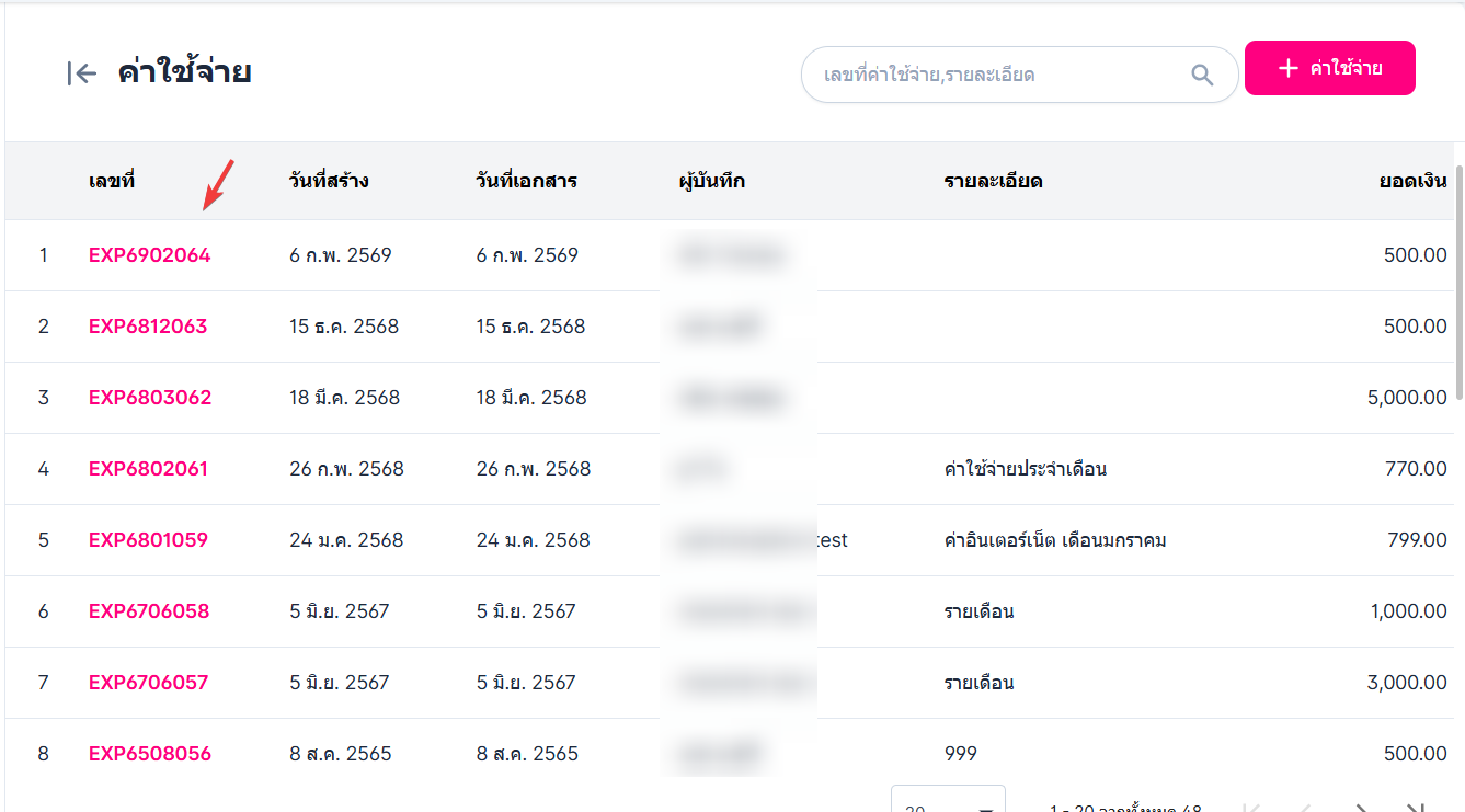 • ให้ผู้ใช้งานคลิกที่เลขที่ค่าใช้จ่าย ที่ต้องการแก้ไข