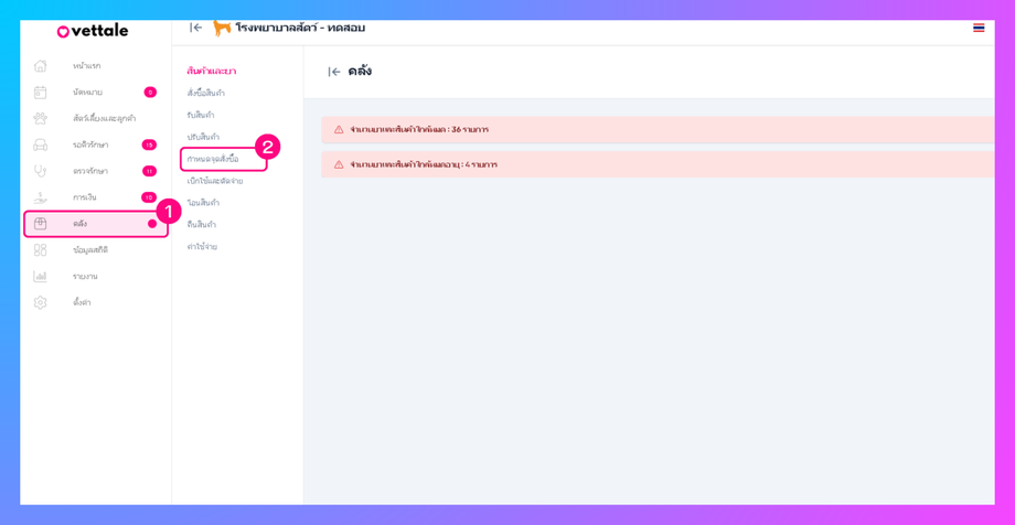 หากผู้ใช้งานต้องการกำหนดจุดสั่งซื้อ ทำได้โดยการไปที่เมนูคลัง > กำหนดจุดสั่งซื้อ