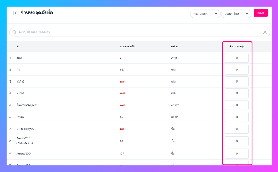 ผู้ใช้งานสามารถกำหนดขั้นต่ำของจำนวนสินค้า ถ้าหากสินค้ามียอดคงเหลือถึงจุดสั่งซื้อ เพื่อให้แสดงรายงานในการสั่งซื้อได้